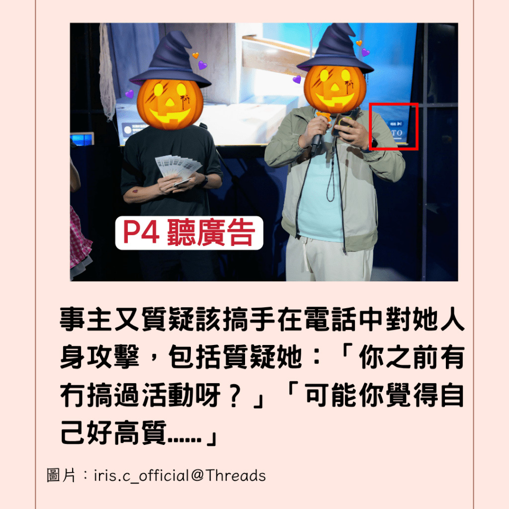 惟對方再度迴避退款問題,女事主只好再作申訴,搞手再度致電給她指「今次活動賺唔到錢」,又稱「錢就一定退唔到㗎啦,你就當呢$550係請人食飯啦」。事主怒斥:「三唔識七我做咩要請你食飯?……我萬聖節係去enjoy,唔係做善事!」她又要求對方出示單據。