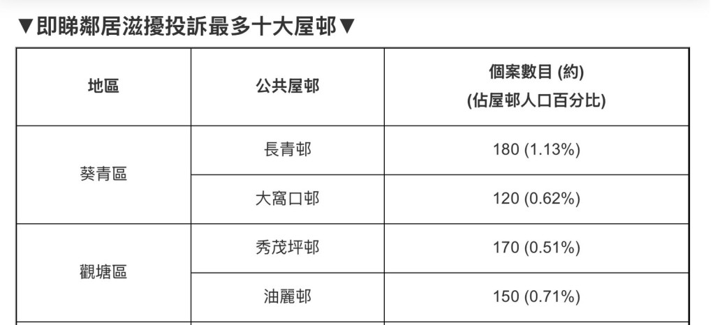在2025年投訴數字中,屯門寶田邨以270宗成為全港最多,青衣長青邨及觀塘秀茂坪邨分別錄得180宗及170宗,排名第二及第三。而西貢區的厚德邨、健明邨及尚德邨合共370宗,令該區成為滋擾投訴的「重災區」。