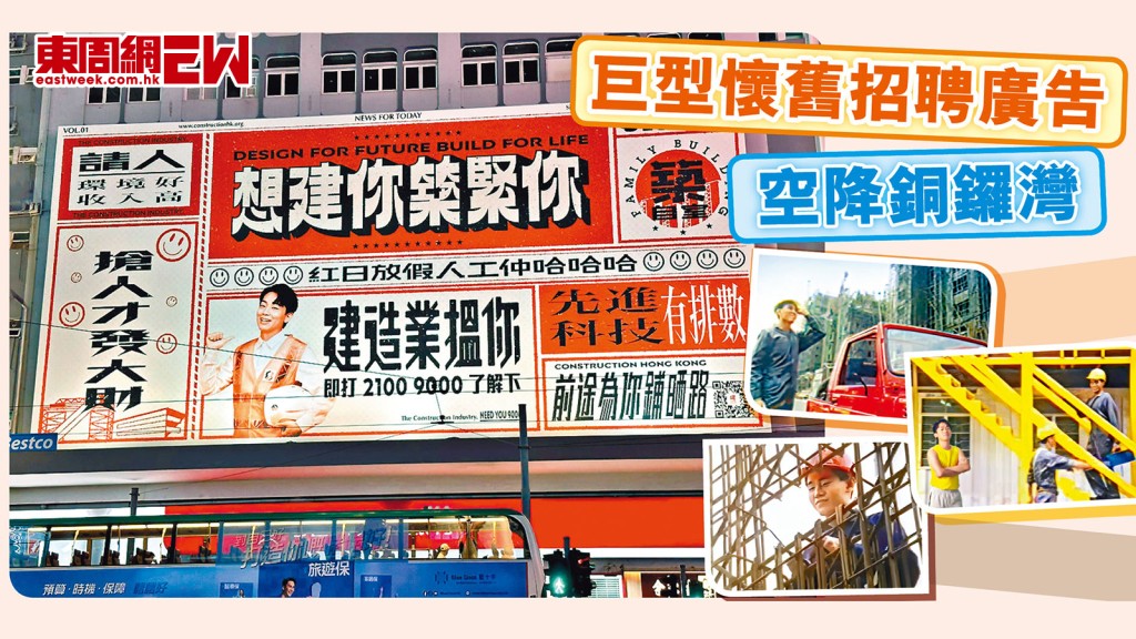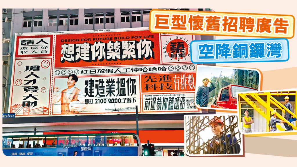 「人工仲,哈哈哈!」建造業經典廣告復刻登場 巨型懷舊招聘廣告空降銅鑼灣 耳目一新廣告新招 鼓勵年輕人加入建造業迎黃金發展期