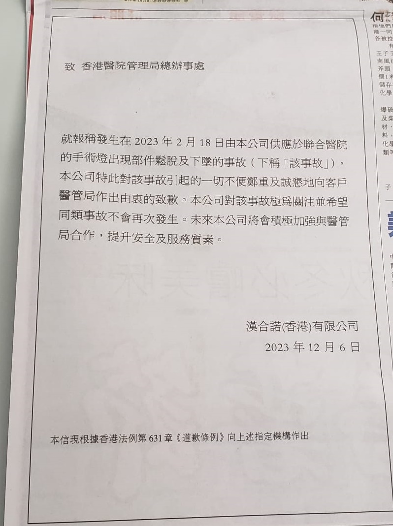 聲明指,該公司就去年2月18日發生的手術燈掉落事故所引起一切不便,鄭重及誠懇地向醫管局作出由衷致歉。聲明強調,公司對事故極為關注,並希望同類事故不再發生,未來會積極加強與醫管局合作,提升安全及服務質素。