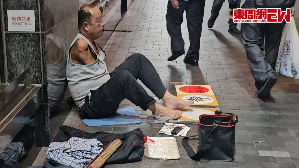 除了乞討者,最近在街頭還出現了許多殘障的「藝術家」。在旺角亞皆老街和西洋菜南街的交界處,有一位失去雙前臂的中年內地男子,他用嘴巴夾著粗大的毛筆,沾上墨水,然後彎腰在紙上寫下「平安喜樂、健康是福」等書法作品,字跡工整美觀。隨後,他改用一對殘肢夾著小毛筆留下自己的名字,旁邊放著一個布袋作為接受施捨的容器,地上還散落著其他書法作品。不久之後,一位中年女性路人捐助了他,用普通話安慰著他。