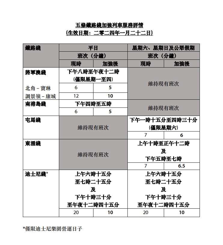 港鐵將於下周一(22日)起,在非繁忙時間的不同時段加密將軍澳綫、屯馬綫、南港島綫、東涌綫及迪士尼綫等5條鐵路綫的班次,預計每周共增加228班車,其中將軍澳綫的北角站至寶琳站,周一至四晚上8時至午夜12時會由現時的6分鐘一班變成5分鐘一班。至於農曆新年節日期間的加強服務安排,港鐵表示會適時公布。