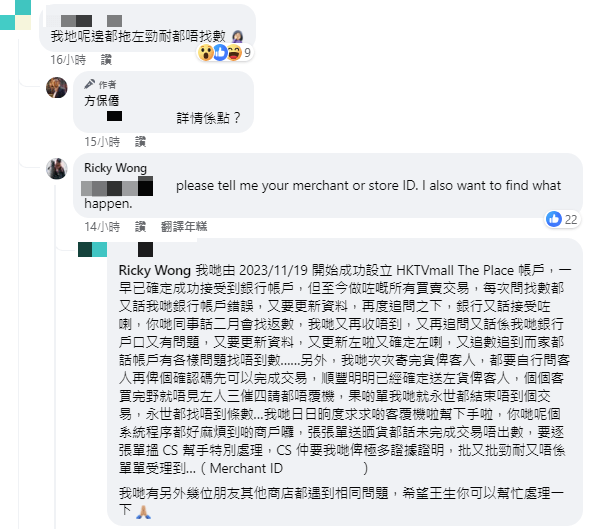 有供應商在資訊科技商會榮譽會長方保僑FB內的帖文留言指,去年11月開設HKTVmall帳戶,但至今所有買賣交易在收貨款時,都被商戶銀行帳戶錯誤,2月的貨款也未獲發放,「每次問找數都又話我哋銀行帳戶錯誤,又要更新資料,再度追問之下,銀行又話接受咗喇……」。另有商戶留言指,認識10多家商戶均有相同問題 。