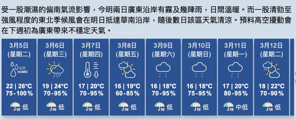 展望明天,天氣初時仍然潮濕,稍後風向轉為偏北,氣溫開始下降,接下來兩三天早晚會感到清涼。