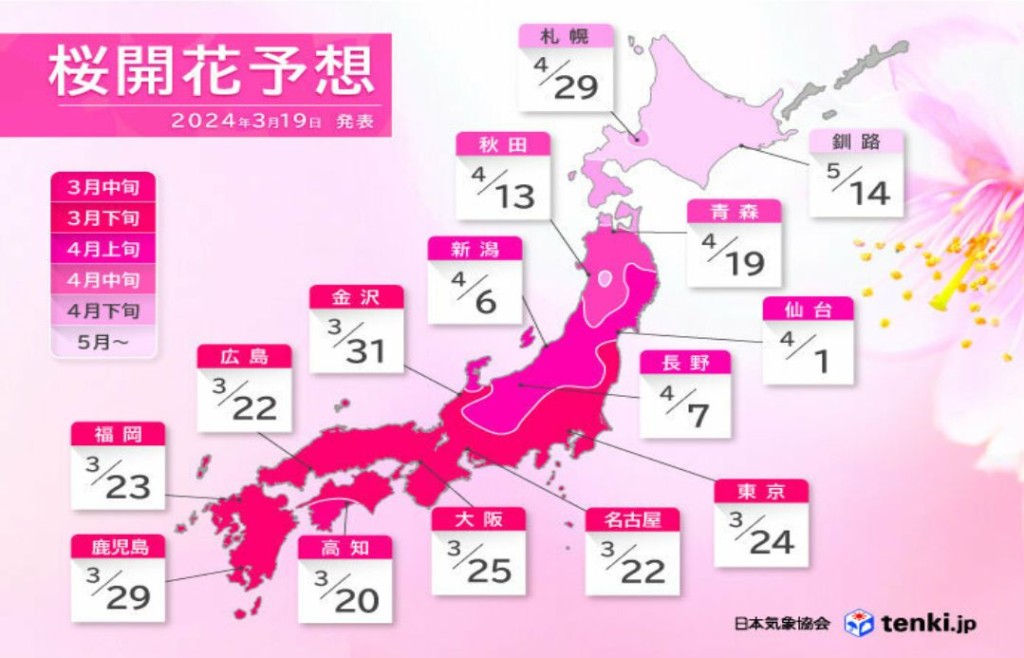 據悉,目前櫻花已成長約七成的東京,市中心的櫻花開花日期估計為3月24日,名古屋和廣島就會在22日。至於最遲開花的北海道則要等至4月下旬才能賞櫻,預料函館的開花時間為4月26日,札幌則為4月29日。