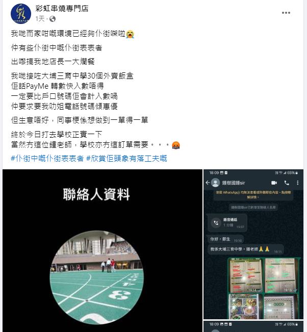 涉事的大埔小店「彩虹串燒專門店」日前在社交平台Facebook專頁發帖指,騙徒自稱是大埔三育中學的鍾老師,想要訂購30個外賣飯盒,但無法以PayMe或轉數快付款,一定要店家提供戶口號碼以免結帳,還要求職員提供上司聯絡電話商討飯盒優惠事宜。職員有感近日生意不景,希望「做到一單得一單」,盡量滿足「客人」需要。不過職員亦謹慎地打電話聯絡校方確認訂單,這才驚悉學校根本沒有「鍾老師」,亦無訂購飯盒的需要,最終因此避過騙局陷阱。