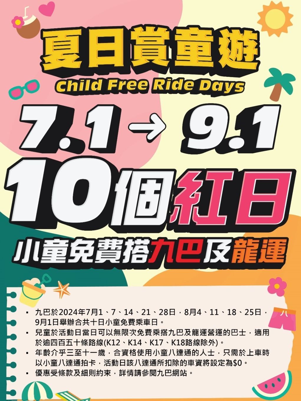 九巴昨日宣布將在7月1日至9月1日期間舉行一項名為「夏日賞童遊」的活動,在連續十個星期日和公眾假期,全港小童當天可免費乘搭超過450條九巴和龍運巴士路線,讓家長和小童能夠輕鬆前往各個地區,共度愉快的假期親子時光。