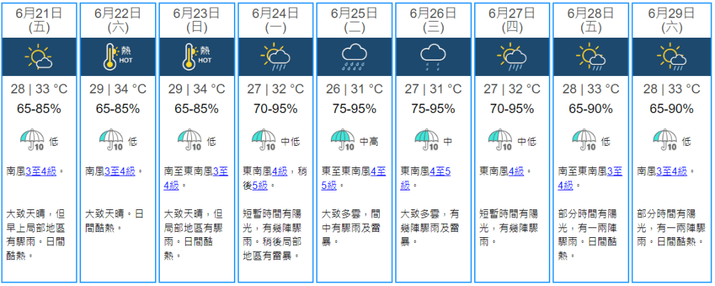 此外,一道廣闊低壓槽預料在周末影響南海中北部,並在下周初靠近華南沿岸,令該區驟雨增多及有雷暴。根據天文台9天天氣預報,自周一(24日)起將連續落足7日雨,雨勢以周二(25日)最大,料有驟雨及雷暴,周四(27日)起短暫時間有陽光,有幾陣驟雨,周五(28日)及周六(29日)則日間酷熱。