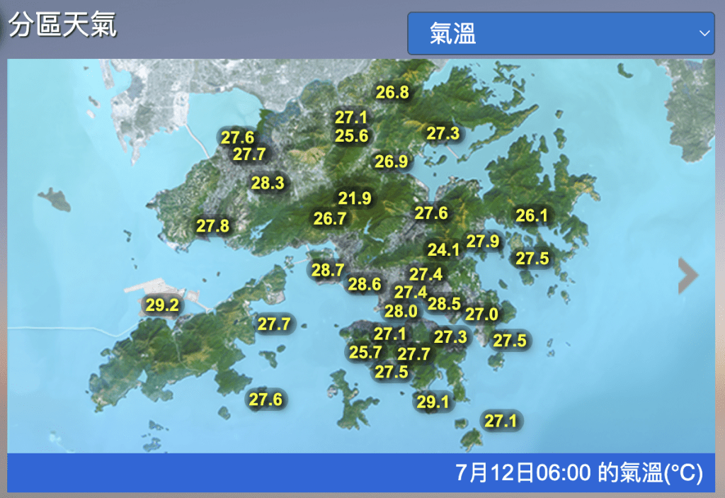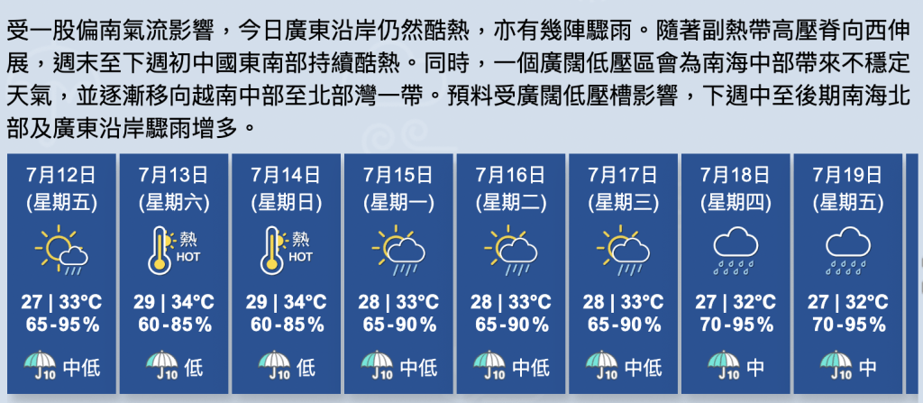 天文台自7月1日發出酷熱天氣警告至今,已持續生效超過10天。最新預報顯示,副熱帶高壓脊南側的廣闊低壓槽在周末及下周將逐漸變得活躍,同時低壓槽上可能會有低壓區形成,甚至發展成熱帶氣旋。此外,天文台今日(12日)下午12時40分發出特別天氣提示,指與偏南氣流相關的雷雨區正逐漸靠近,並會在未來一兩小時影響本港。市民外出宜留意天氣變化。
