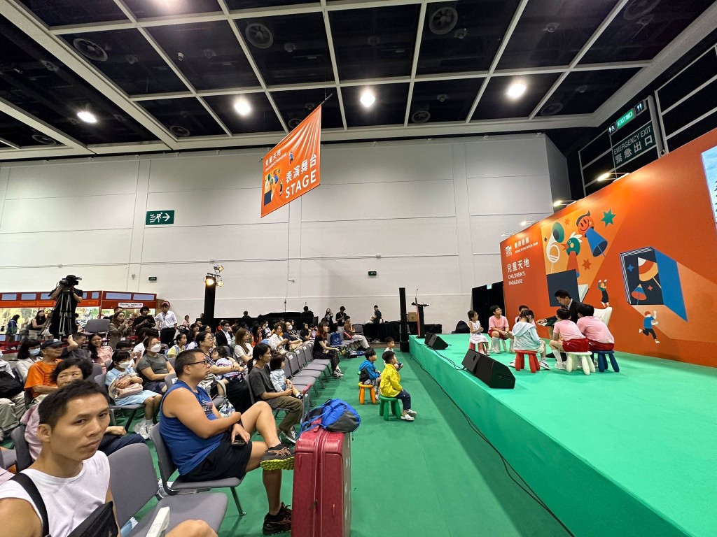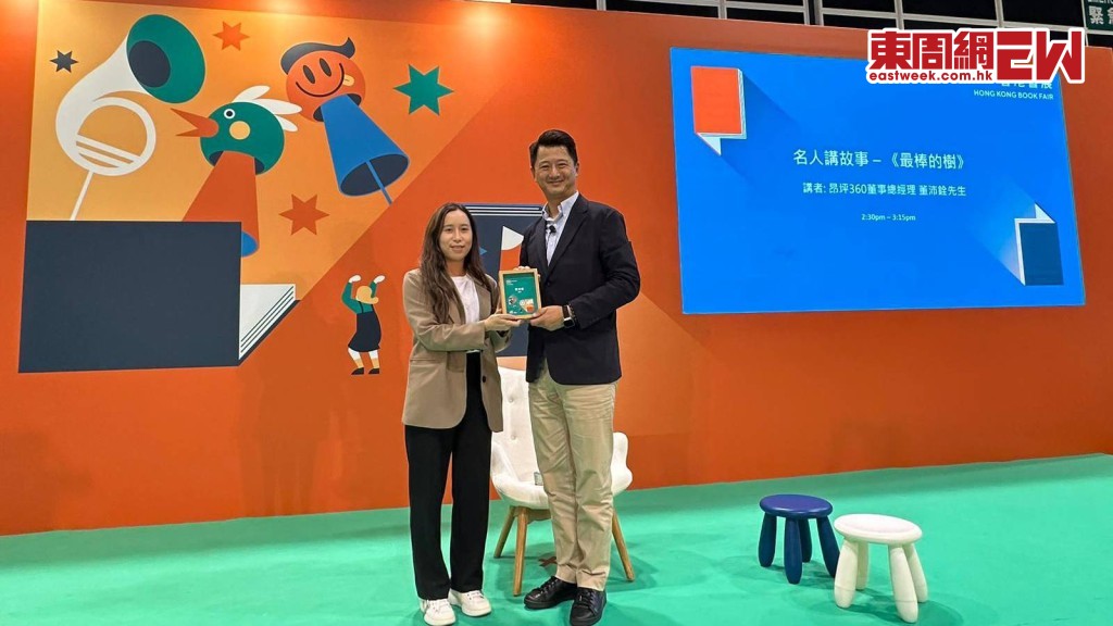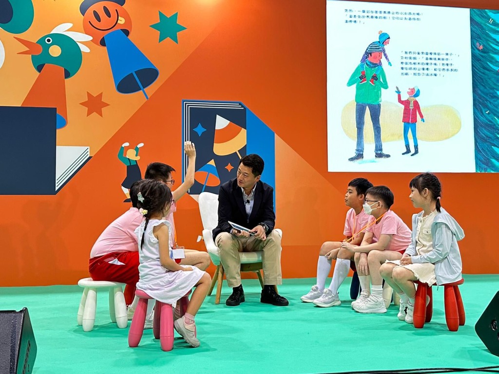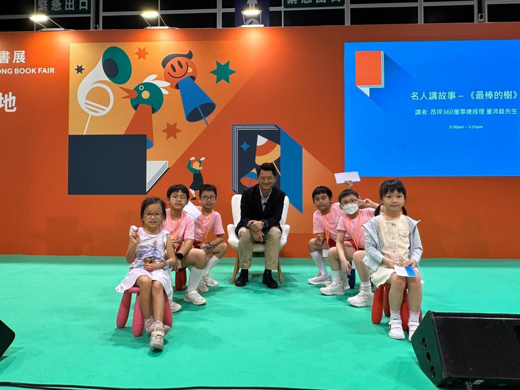 今年書展「名人講故事」的環節,其中一位嘉賓是昂坪360的董事總經理董沛銓(James)。與往常講述旅遊和管理話題不同,他這次為現場的小朋友演繹了一個兒童故事。在場的小朋友專注地聽著,現場也有不少家長一同參與。
