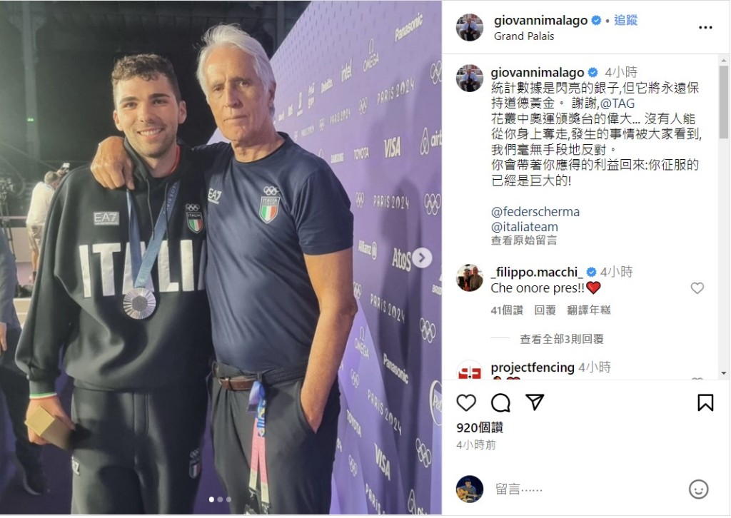 在巴黎奧運男子花劍决賽中,張家朗與意大利選手馬池(Filippo Macchi)爭奪金牌。張家朗在第三次「決一劍」階段最終刺中對手,裁判宣布張家朗獲勝。據外媒報導,意大利劍擊聯會已向國際劍聯(FIE)和國際奧委會(IOC)提出正式抗議。意大利奧委會主席Malago對裁判表示不滿,認為台北的裁判偏袒張家朗。張家朗獲勝後,許多意大利網民在其社交平台上留言批評,甚至聲稱馬池的金牌「被盜」。