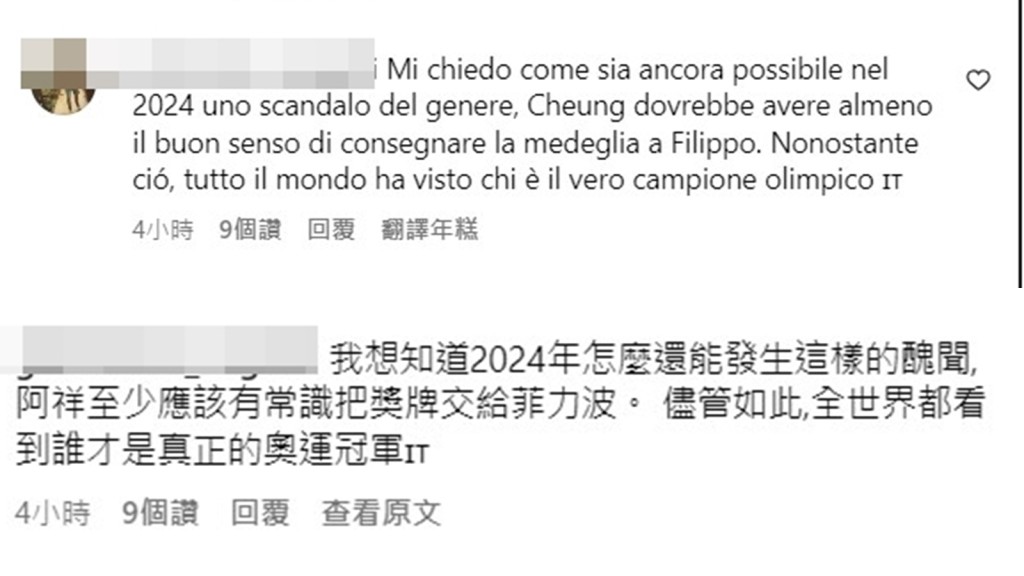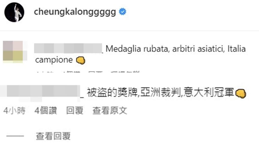 香港網民則在社交平台上支持張家朗,批評意大利方面輸掉比賽後要賴裁判。他們質疑對手不能接受失利就指責裁判。
