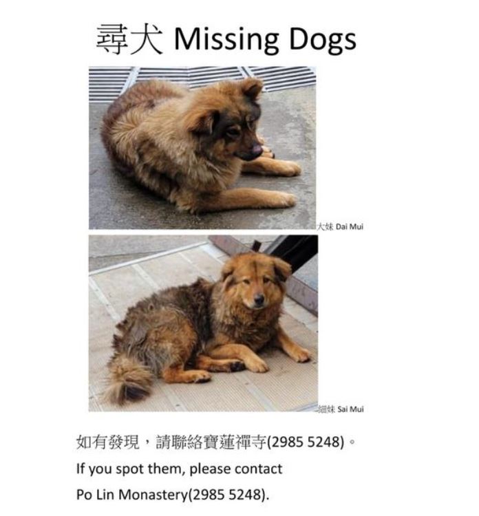 有大嶼山寶蓮禪寺員工駕車將兩隻狗運往後山棄置。警方上周六(17日)以涉嫌「殘酷對待動物」之名,拘捕了兩名寶蓮禪寺的廚師。遺憾的是,被棄置的兩隻狗「大妹」和「細妹」仍然下落不明。在今日凌晨,救援動物組織「毛守救援」的創辦人Kent在多個社交平台上發布懸賞帖,總額達10萬元,希望尋找到這兩隻狗的下落。