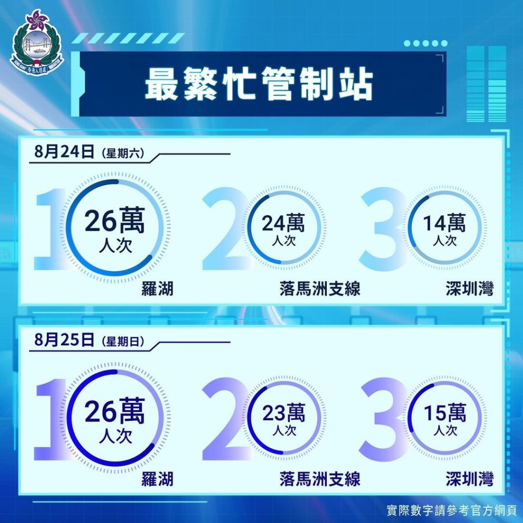 隨著暑假接近尾聲,入境處在最近的週末(24及25日)統計顯示,逾118萬和121萬人次透過各管制站進出香港,創下自疫情後全面通關以來的新高紀錄。港人北上消費熱潮未有減退,而這兩天最繁忙的管制站均為連接中國內地的陸路管制站,依序為羅湖(26萬人次)、落馬洲支線(24萬及23萬人次),以及深圳灣(14萬及15萬人次)。