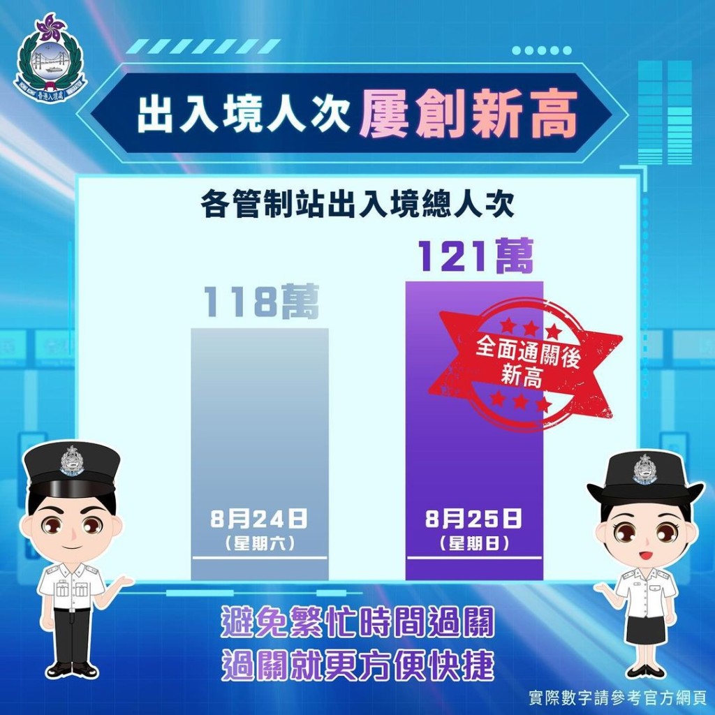 入境處指出,儘管暑假期間各管制站極度繁忙,出入境人次不斷攀升,但各管制站的人流依然維持順暢和有序。入境處人員將繼續堅守崗位,不懈努力,確保各管制站在旅客高峰時段依然運作順暢,為香港居民和訪港旅客提供高品質和便捷的出入境服務。