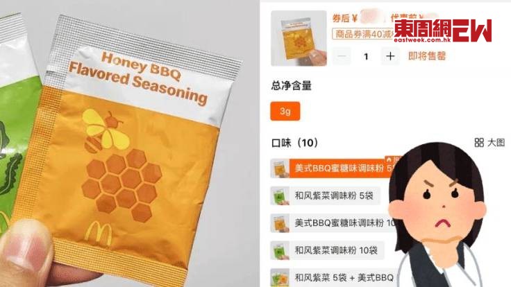 有網民在Threads上分享,發現淘寶商家以高價出售香港麥當勞的Shake Shake粉。該商家的主頁顯示,Shake Shake粉有5包和10包的選擇,除了經典的和風紫菜口味和美式BBQ蜜糖口味外,還有幾款限定口味,如櫻花蝦、明太子和芝士,售價更是讓網友驚訝,直言「佢仲過分過啲黃牛。