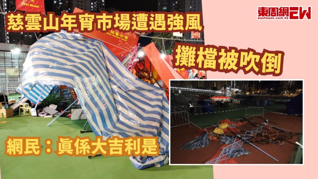 這是慈雲山首次於中央遊樂場舉行年宵市場,但人流和攤位情況不如預期,場面顯得冷清。昨晚10時許,距離營業時間還有約1小時,已有3個攤檔被強風吹倒,其中一個由救世軍維廉中學設立的攤位,整個帳篷、支架及帆布被吹倒,其他兩個攤位的產品也受到影響。幸而事件中無人受傷,保安員及時用膠帶圍封倒塌的攤位並清理現場。