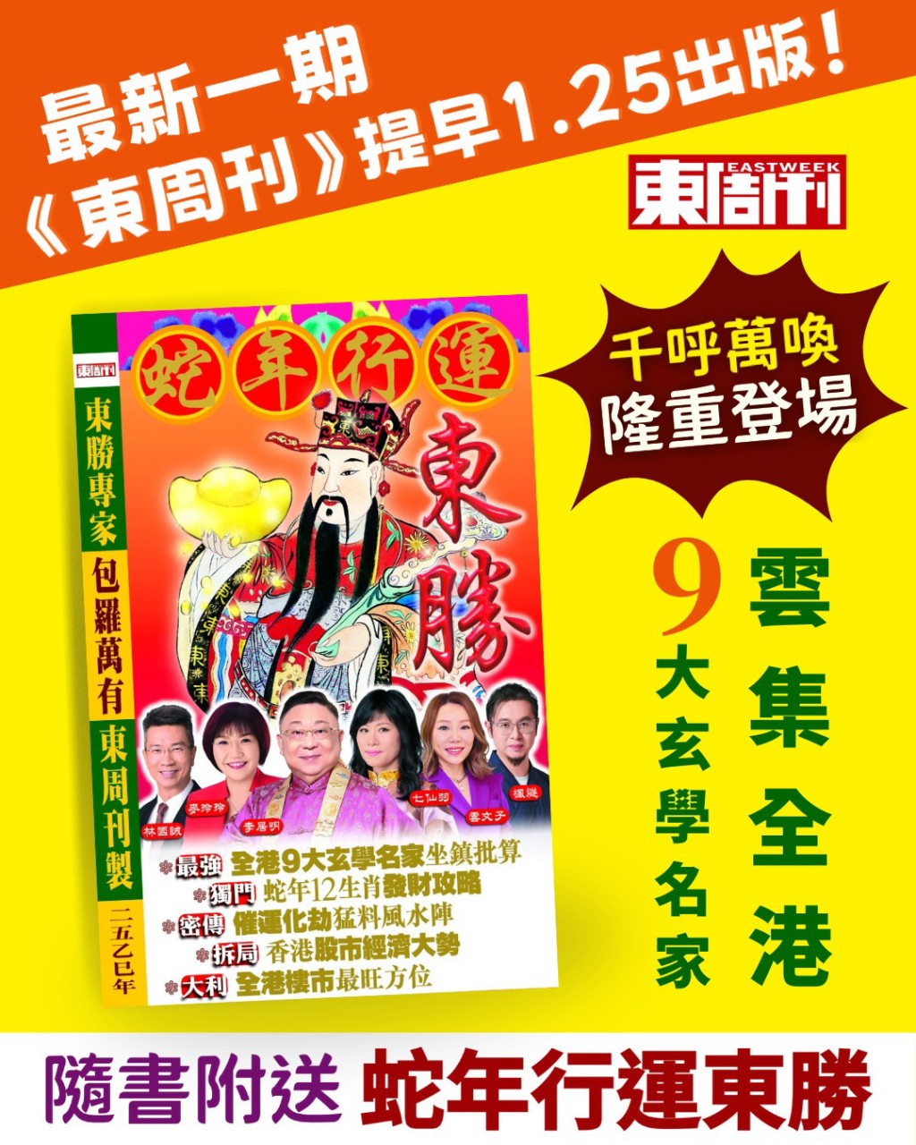 千呼萬喚的《蛇年行運東勝》於1月25日隆重登場,雲集全港9大玄學名家!隨最新第1118期《東周刊》附贈,於便利店、各大報攤發售,記得去買返本睇吓點蛇年如何行大運啦!